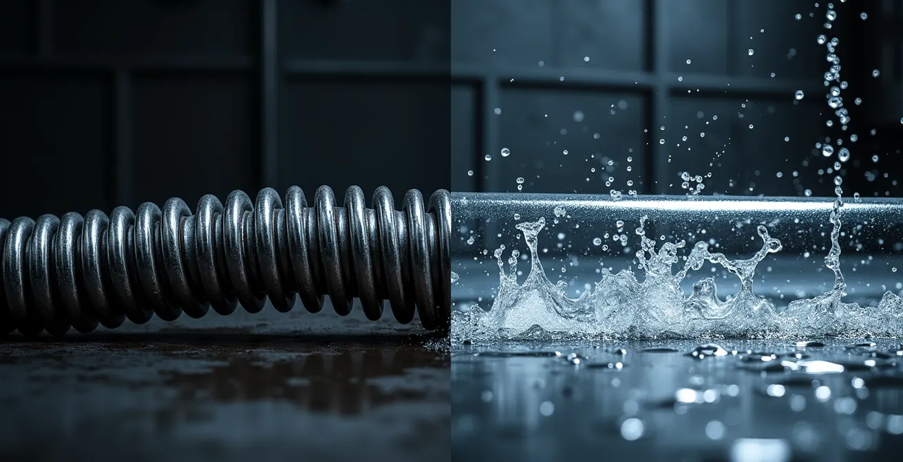 On vous a parlé du furet, cet outil de plombier presque mythique. On vous a aussi vanté la puissance de l’hydrocurage, cette fameuse « haute pression » qui semble pouvoir tout balayer. Mais face à l’urgence, la confusion règne. Choisir au hasard, c’est risquer de perdre du temps, de l’argent, et pire, d’endommager vos installations. La véritable approche d’un professionnel ne repose pas sur une préférence pour un outil, mais sur un diagnostic précis de la situation.